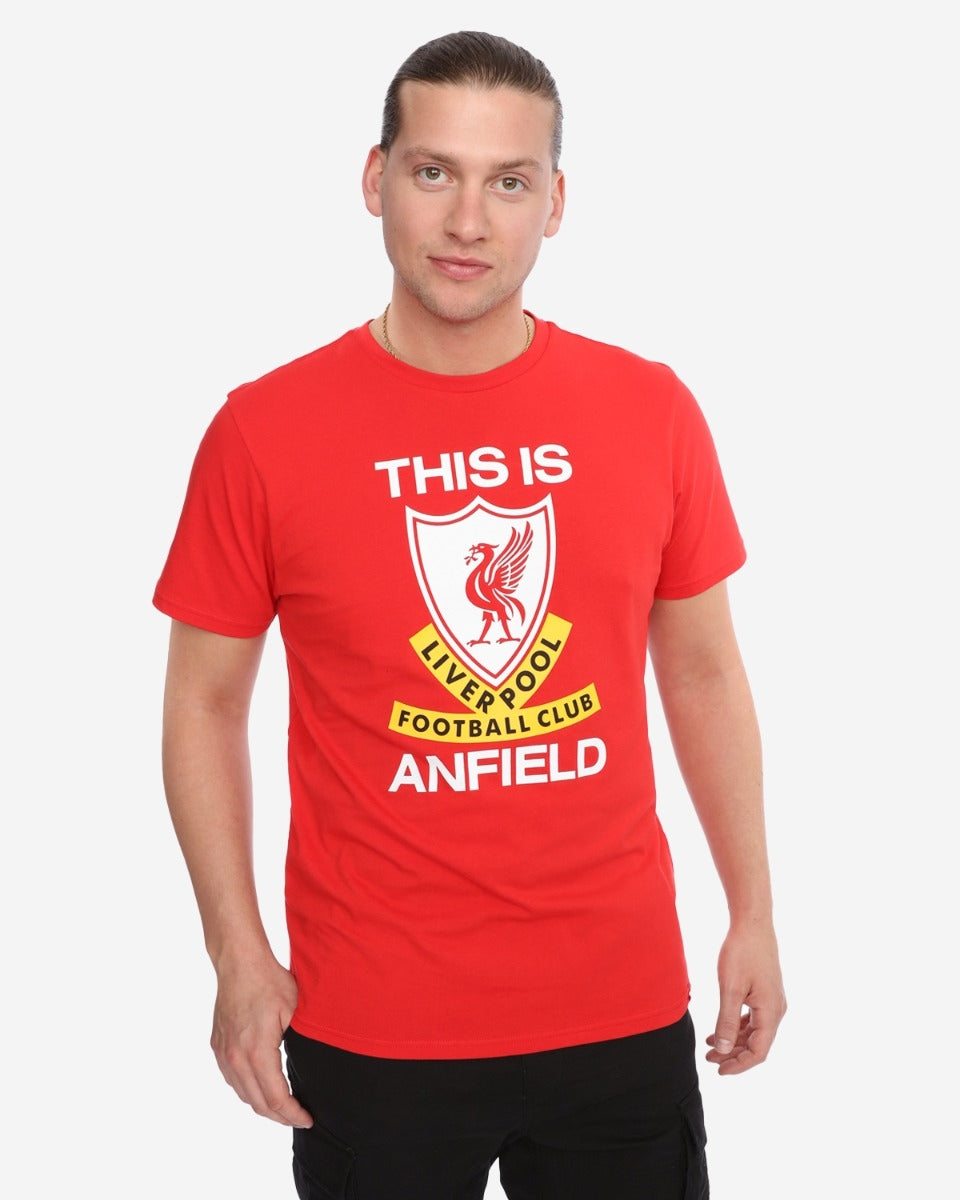 تيشيرت أحمر بأكمام قصيرة وياقة دائرية مع طباعة «هذا هو أنفيلد» على الجهة الأمامية.