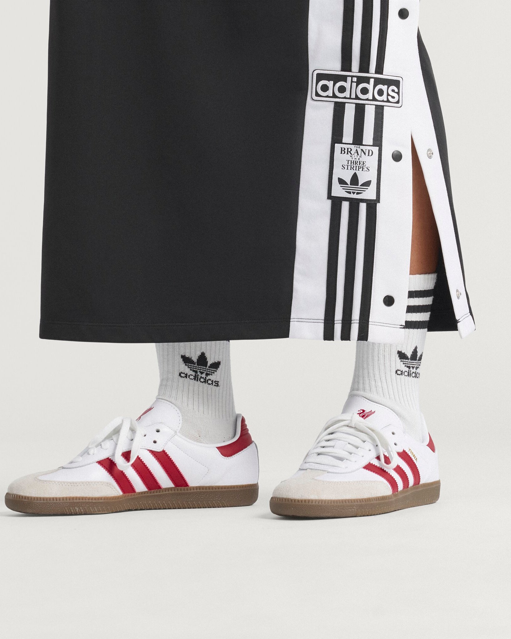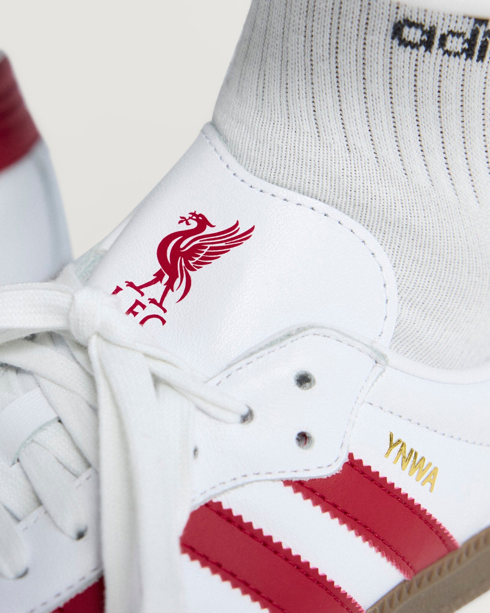 Make a real statement in a fresh pair of Liverpool adidas home Sambas. A soft leather upper and suede T-toe are supplemented by the LFC crest on the tongue and YNWA detailing, so there can be no doubt where your allegiances lie. It's an iconic shoe, perfect for the fashion-conscious football fan.