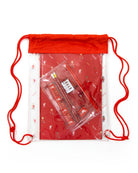 - مجموعة أدوات مكتبية متينة في حقيبة رياضية بلاستيكية شفافة مع حلقة سحب، وحبل بوليستر، وفتحات فضية × 2.
