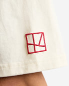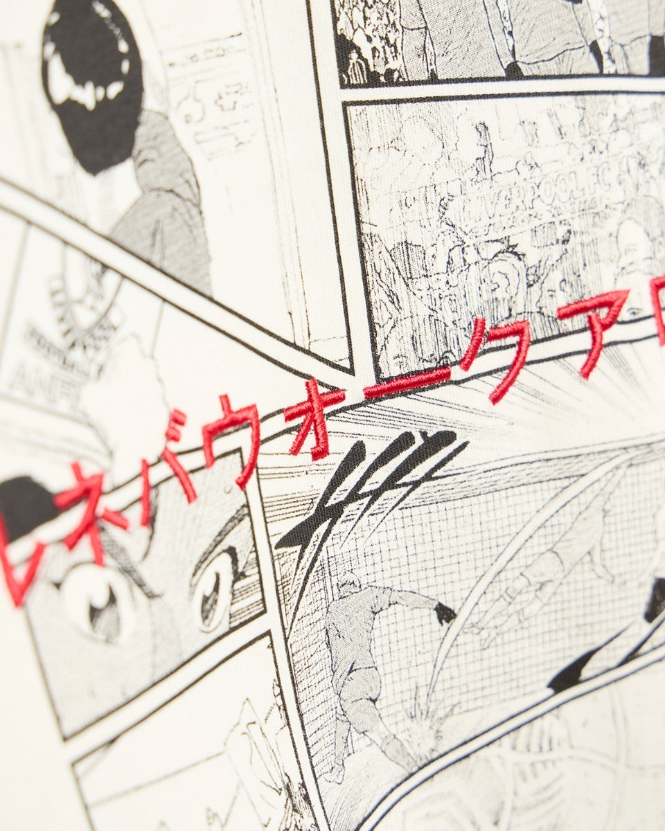 - طباعة جرافيكية من كودانشا على الظهر تتميز بتطريز نصي ياباني باللون الأحمر.