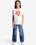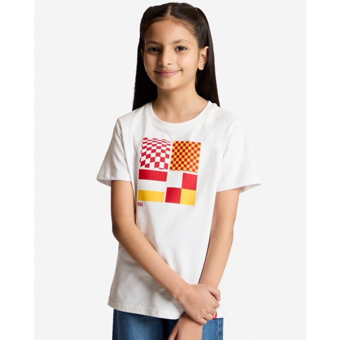 - تي شيرت جونيور أبيض بأكمام قصيرة ورقبة دائرية مع تصميم جرافيكي منقوش على الجهة الأمامية.