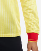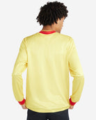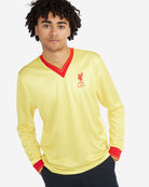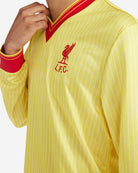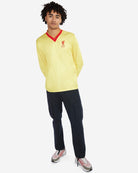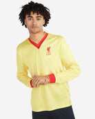 - قميص رجالي أصفر بأكمام طويلة مع تطريز طائر ليفربول باللون الأحمر على الصدر الأيسر.