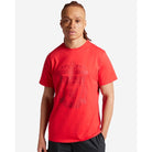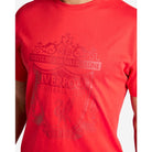 - طباعة شعار مسطح باللون الأحمر الداكن على الجزء الأمامي من التي شيرت الأحمر.