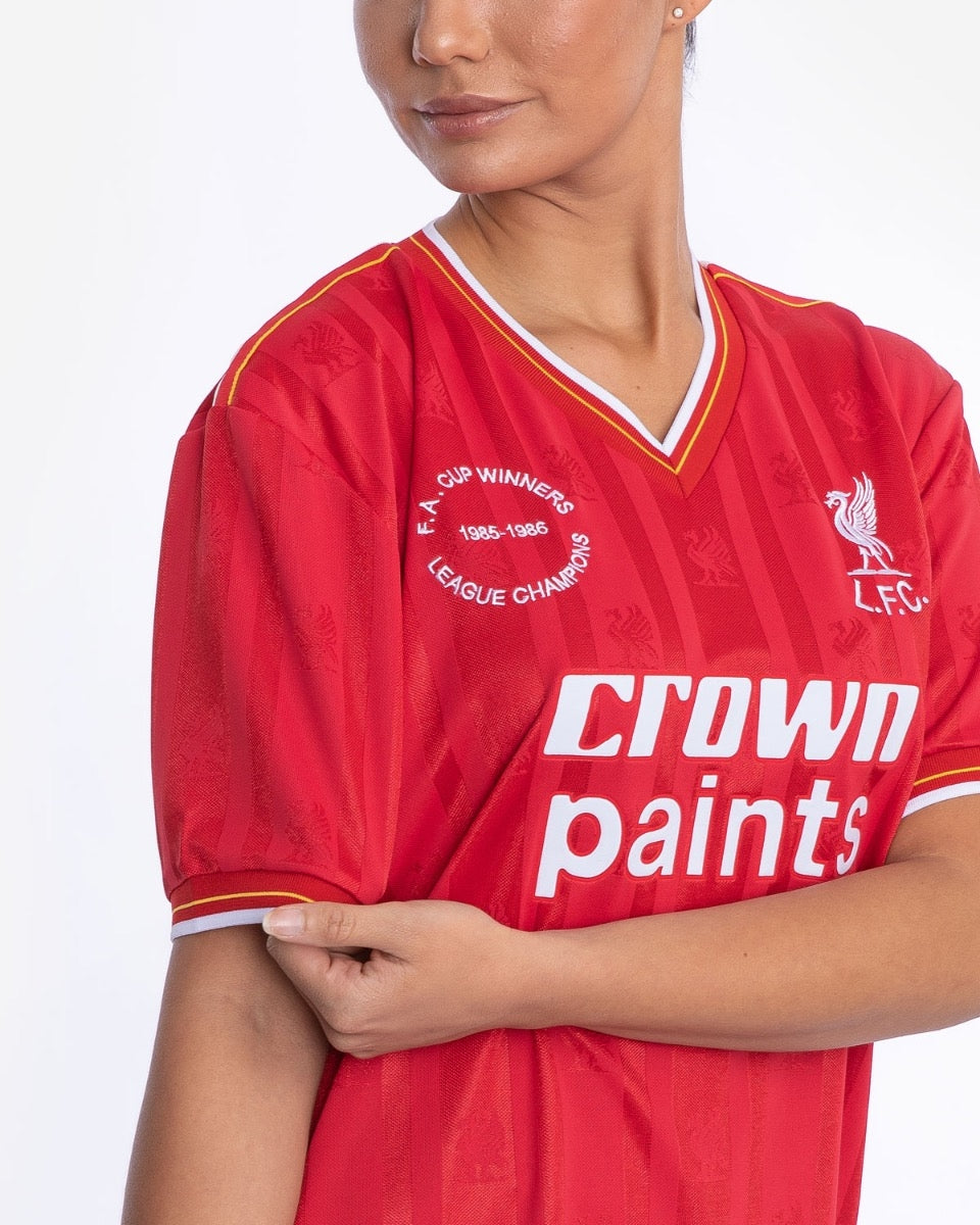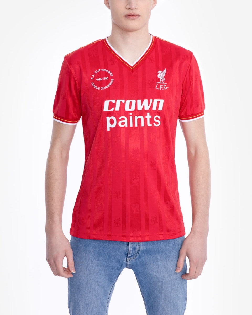 كان موسم 1985/86 هو الموسم الأول لكيني دالجليش كمدرب، مما قادهم إلى فوز مزدوج بكأس الاتحاد الإنجليزي ولقب الدوري. مميزات قميص LFC Retro 1986 Home: