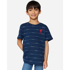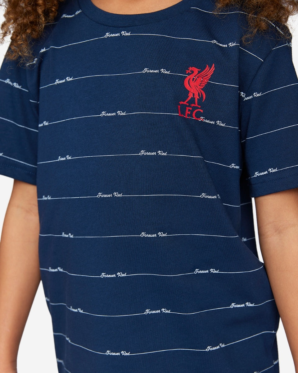 - Navy short sleeve crew neck tee with LFC Liverbird in Red and repeat white printed lines with Famous Red text.