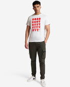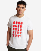 - تي شيرت أبيض بأكمام قصيرة ورقبة دائرية مع طباعة جرافيكية في منتصف الصدر.