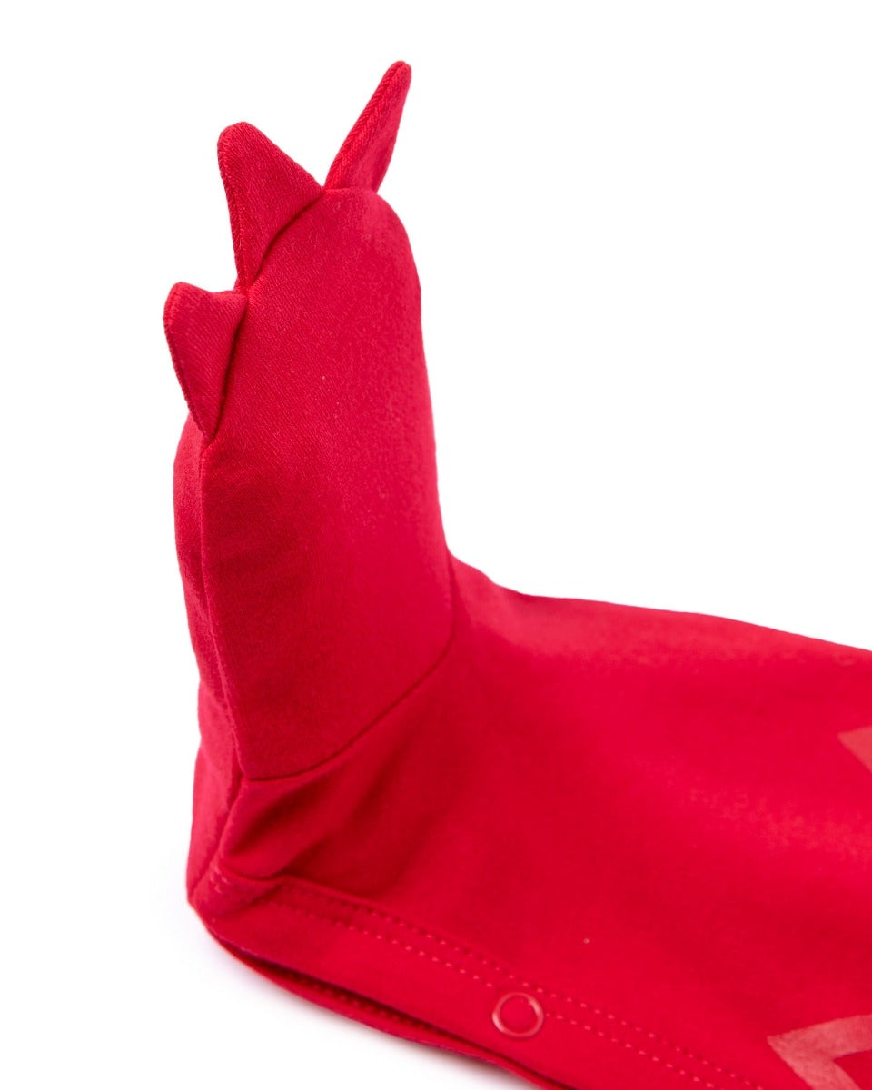 - بدلة نوم حمراء مع صور Mighty Red وريش Liverbird المزخرف على الرأس والظهر.
