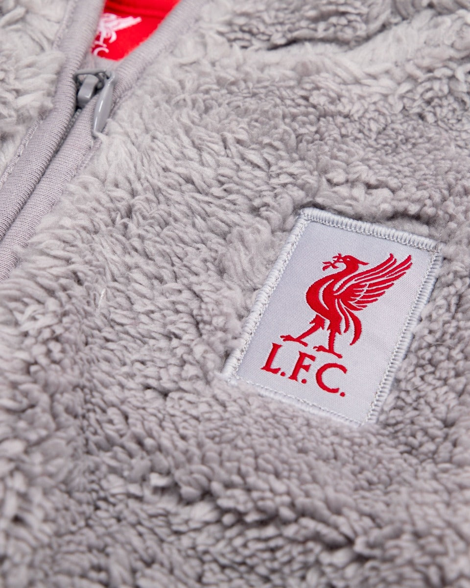 - بدلة جسم كاملة بغطاء رأس وسحّاب على شكل دب تيدي باللون الرمادي مع تطريز أحمر لشعار LFC Liverbird على الصدر الأيسر.