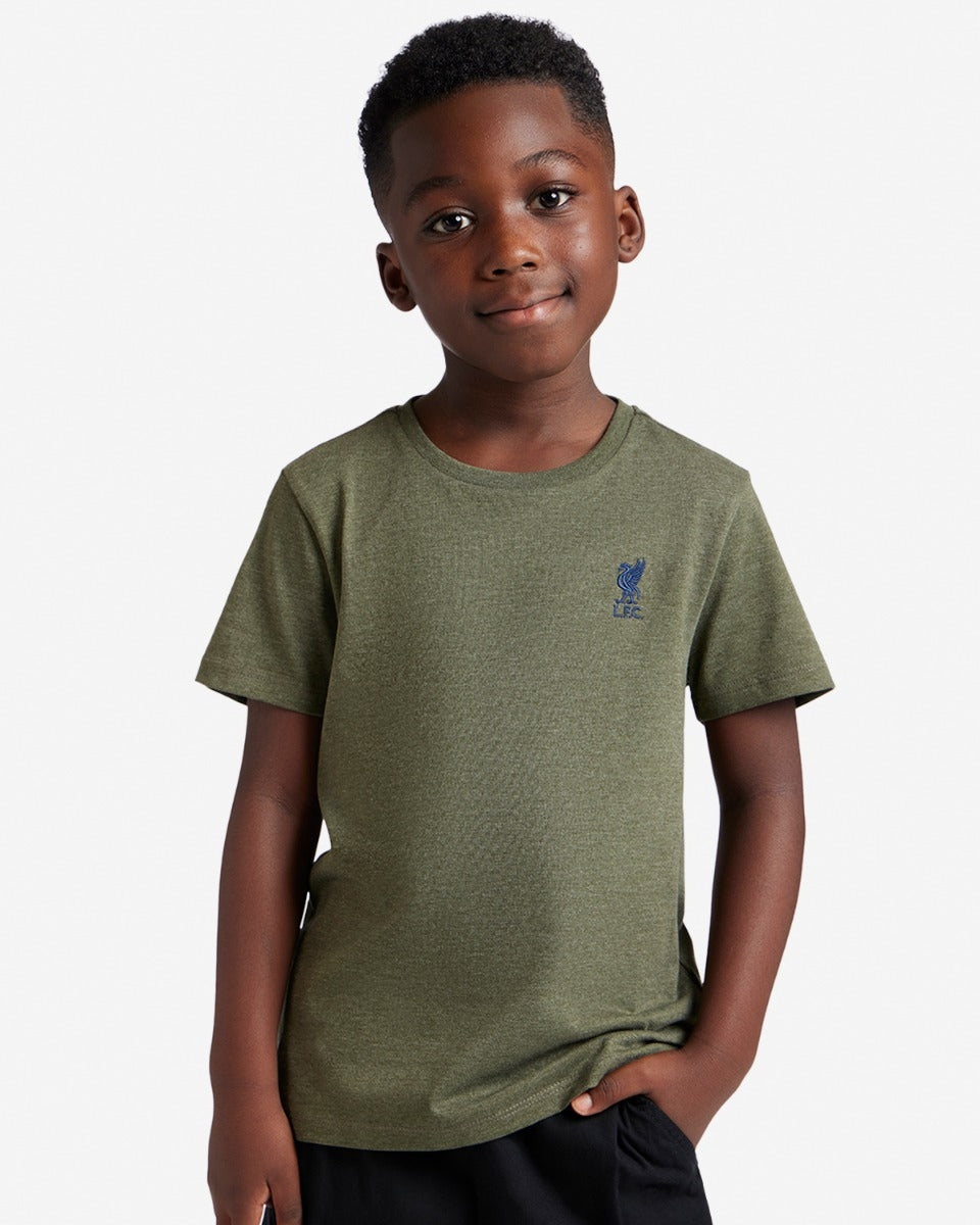 <li><strong>تيشيرت مارل باللون الكاكي للأطفال بأكمام قصيرة وفتحة رقبة دائرية مع تطريز شعار LFC والطائر ليفربيرد على الجانب الأيسر من الصدر.</strong></li>