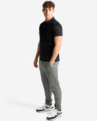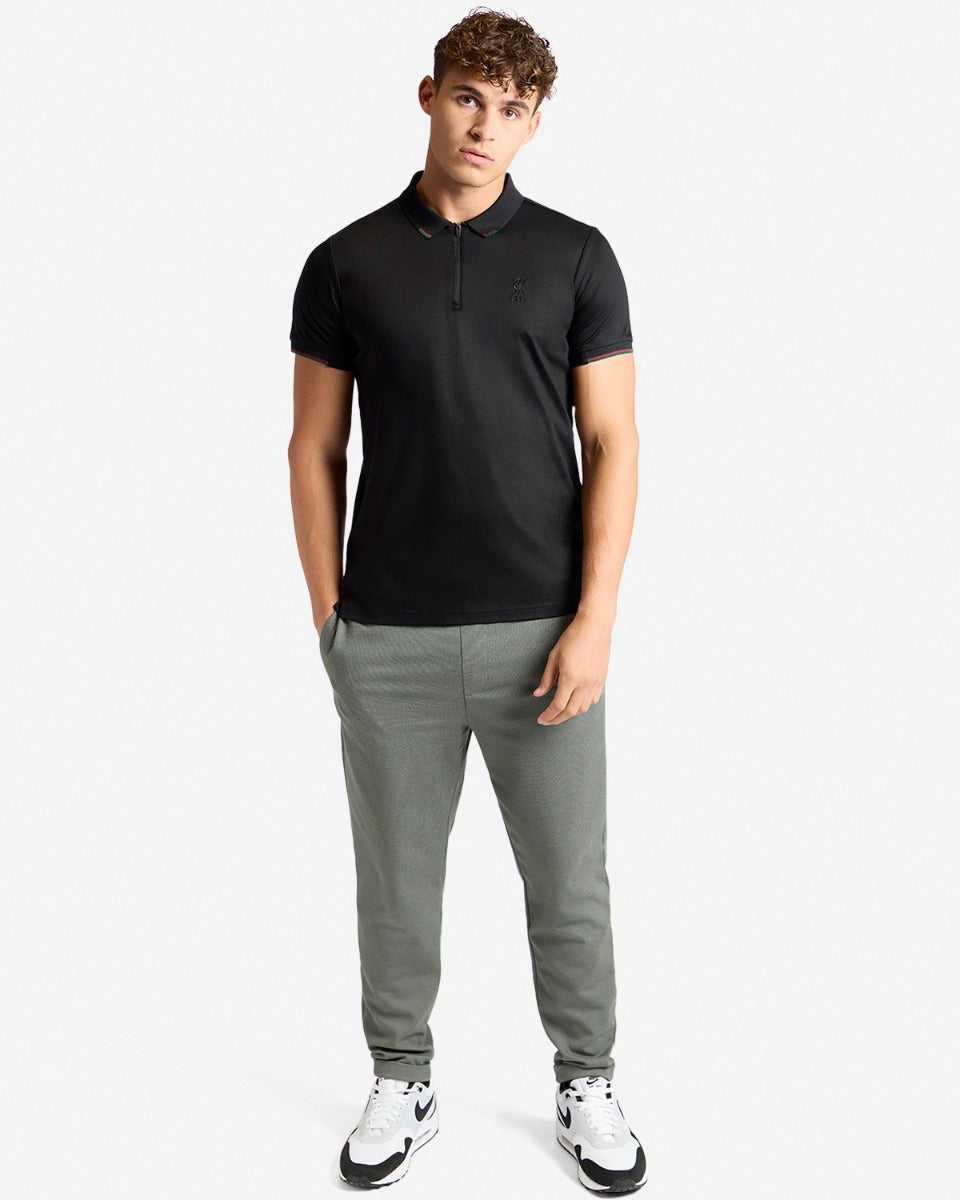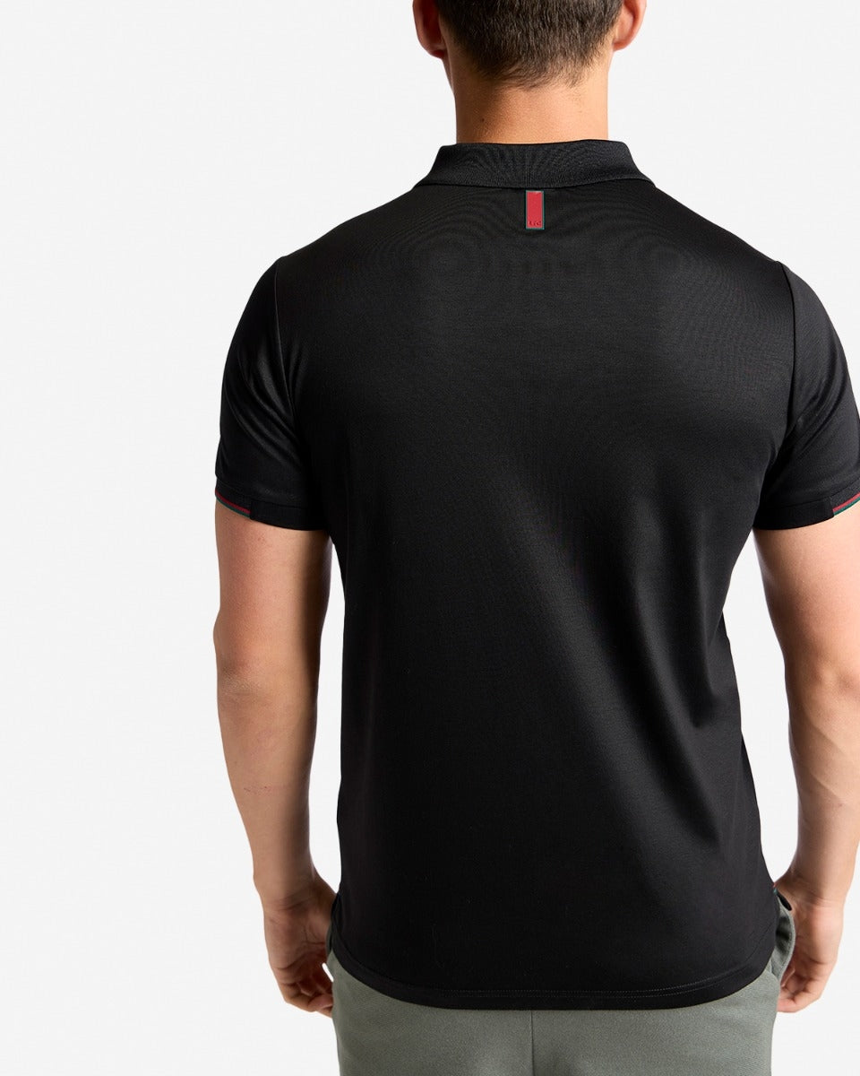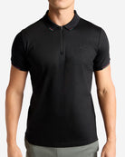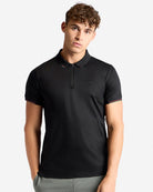 • قميص بولو أسود بأكمام قصيرة ونسيج ناعم الملمس.