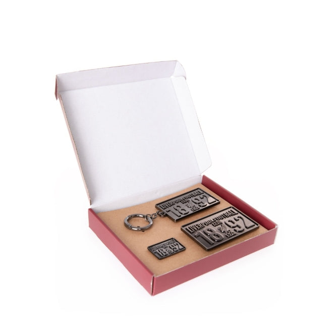 - شارة (3 × 2 سم) مغناطيس (7 × 4.2 سم) سلسلة مفاتيح مع سلسلة (11 سم × 4 سم) سلسلة مفاتيح قطرها 2 سم.