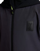 • سترة سوداء ذات رقبة قمعية وغطاء رأس وسحاب.