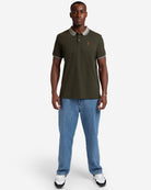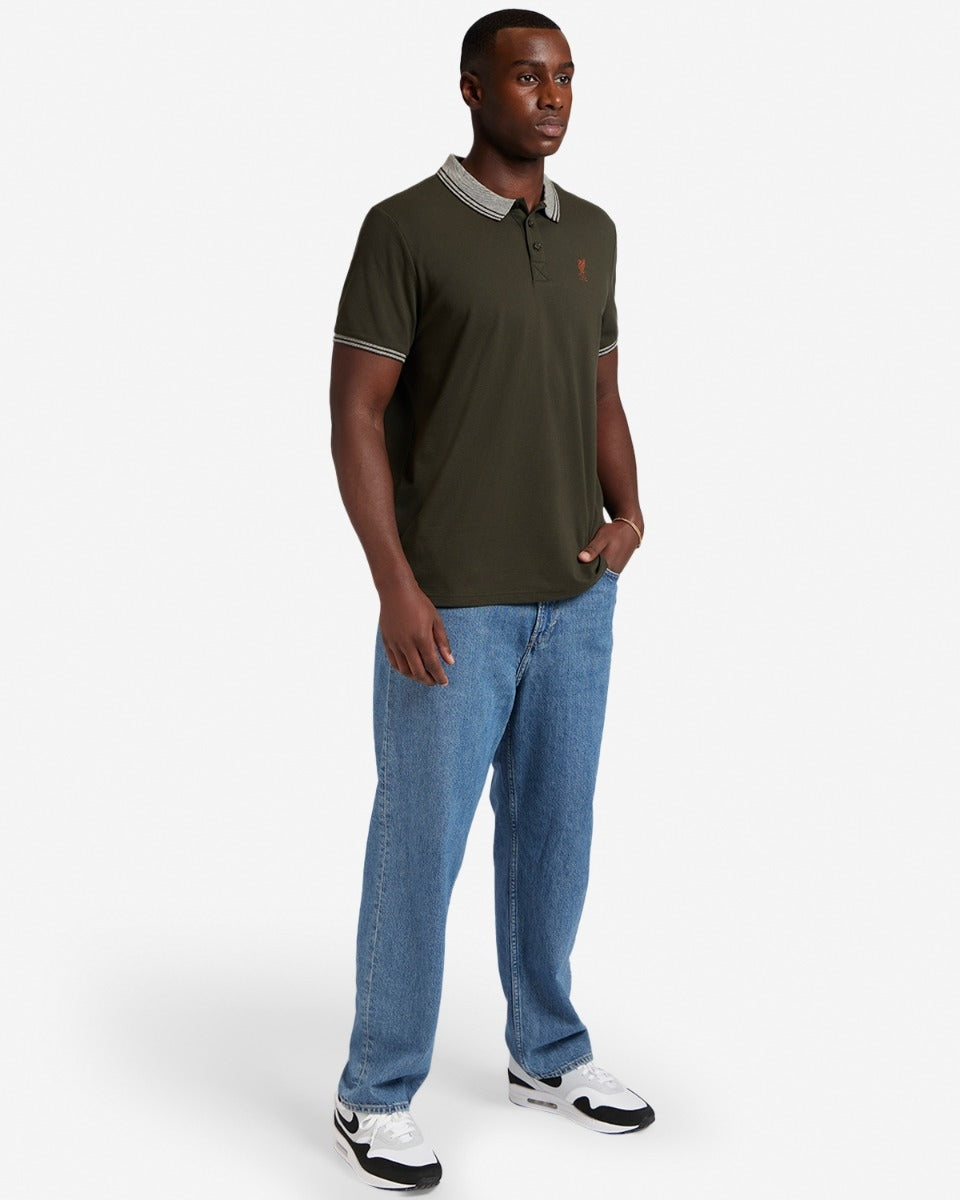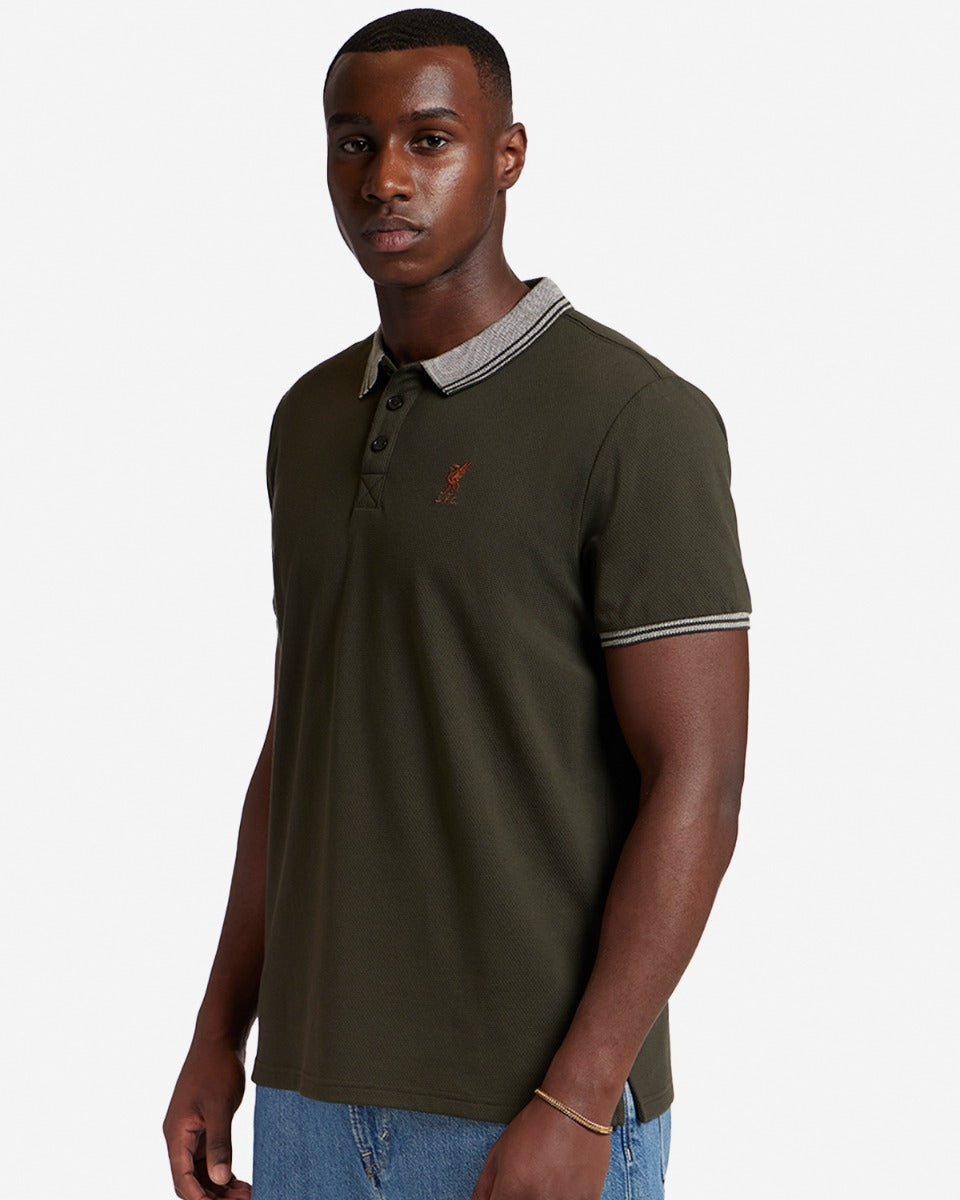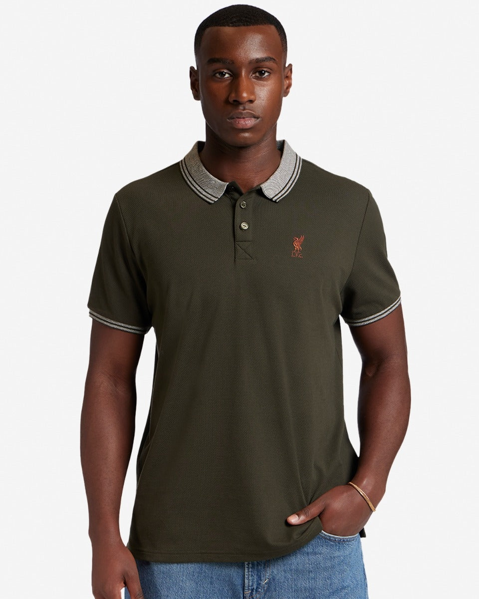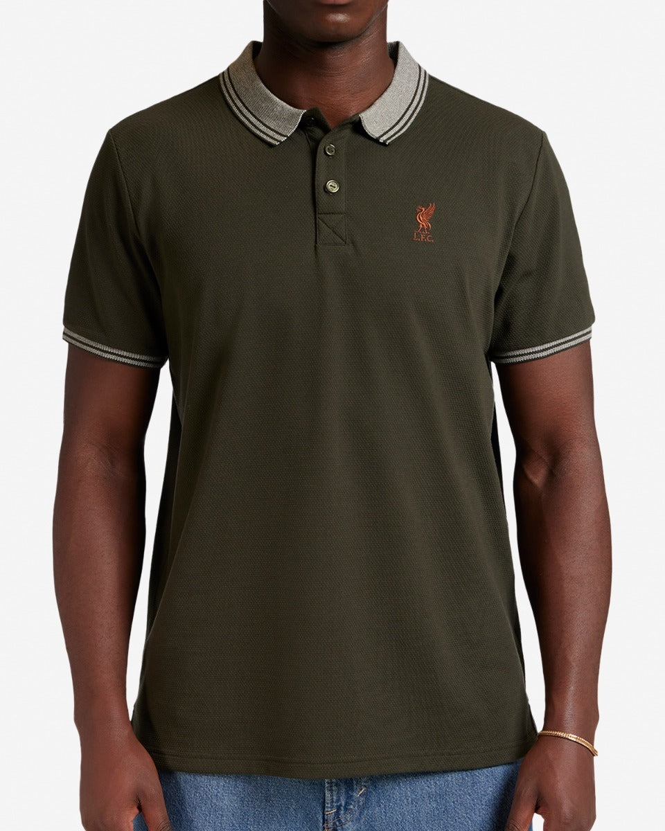 - قميص بولو رجالي من قماش الكاكي مع تطريز LFC Liverbird على الصدر الأيسر.