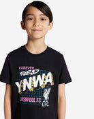 - تي شيرت أسود بأكمام قصيرة ورقبة دائرية مع طباعة رسومية لـ YNWA وLFC Liverbird وFOREVER RED وصورة نصية LIVERPOOL FC على المقدمة.