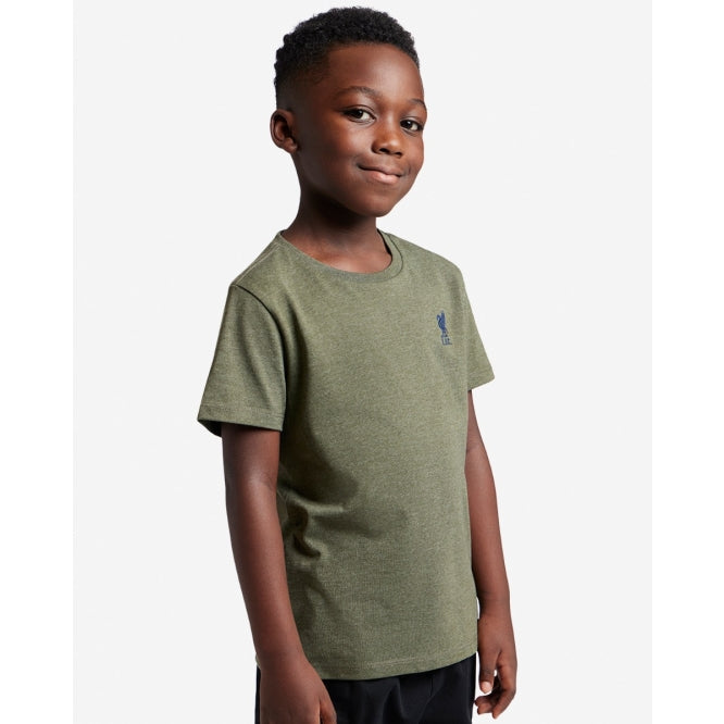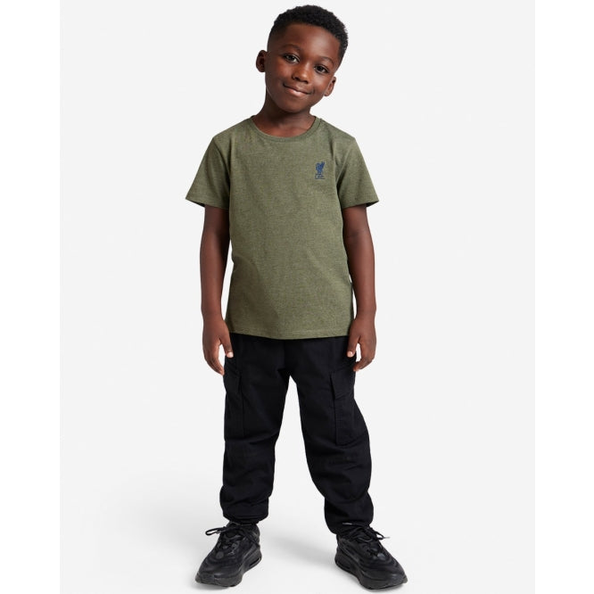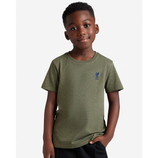 • تي شيرت Marl Khaki للصغار بأكمام قصيرة ورقبة دائرية مع تطريز LFC Liverbird على الصدر الأيسر.