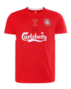 يُعرض داخل صندوق تقديم فاخر باللون الأحمر مزين بتفاصيل نادي ليفربول. القميص الأساسي لموسم 2004/05 موقع يدويًا من أسطورة النادي جيمي كاراغر، احتفاءً بالموسم الذي شهد الفوز بكأس أوروبا الخامسة في إسطنبول.