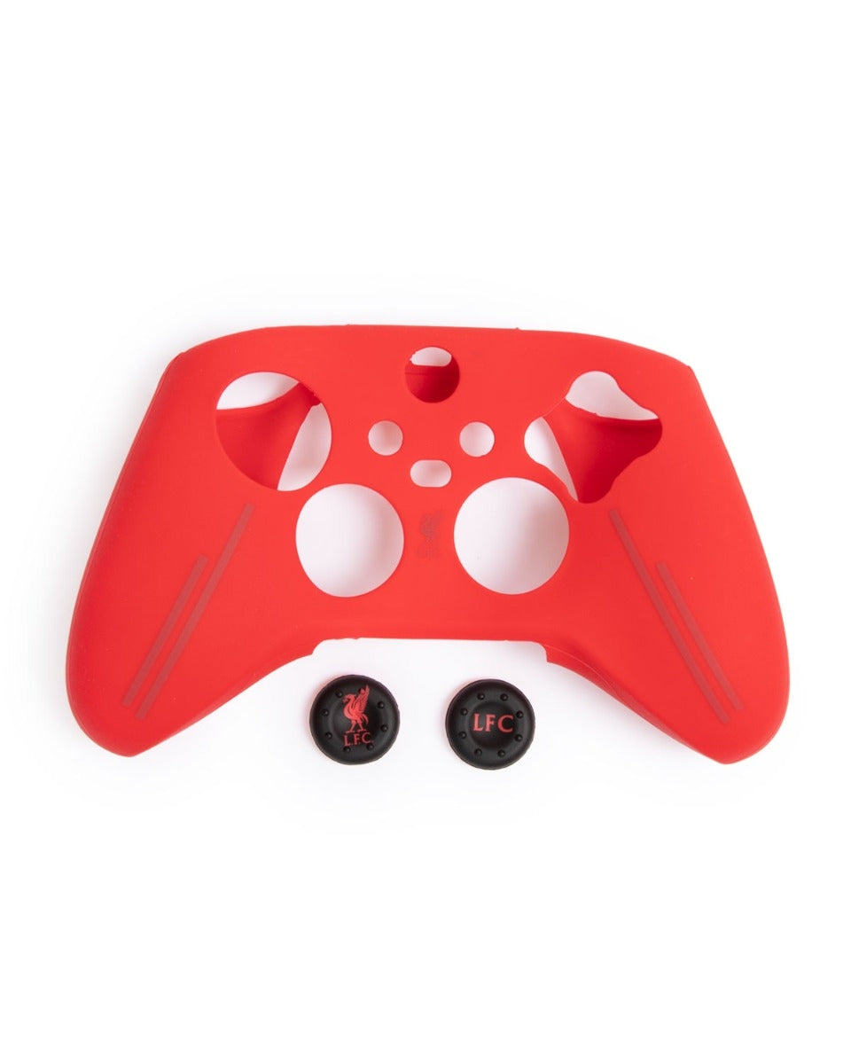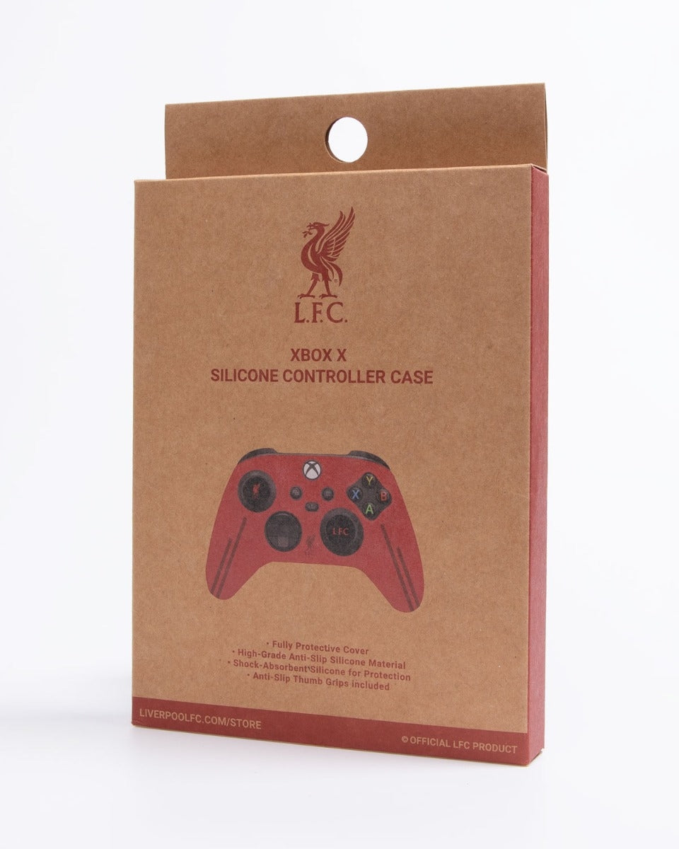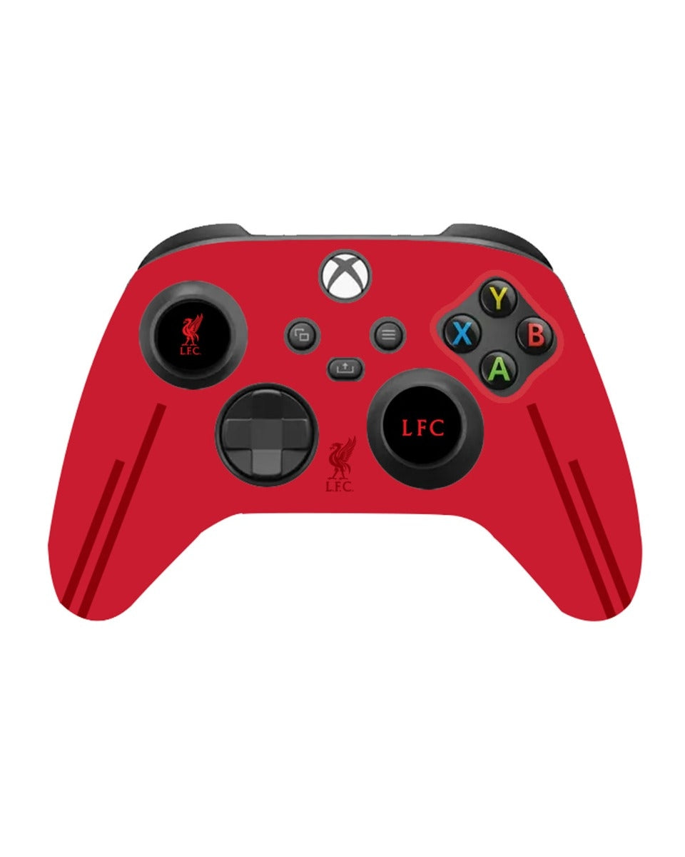 - حقيبة تحكم Xbox X باللون الأحمر ذات طابع LFC، مع صور Liverpool FC Liverbird على الجسم الرئيسي.