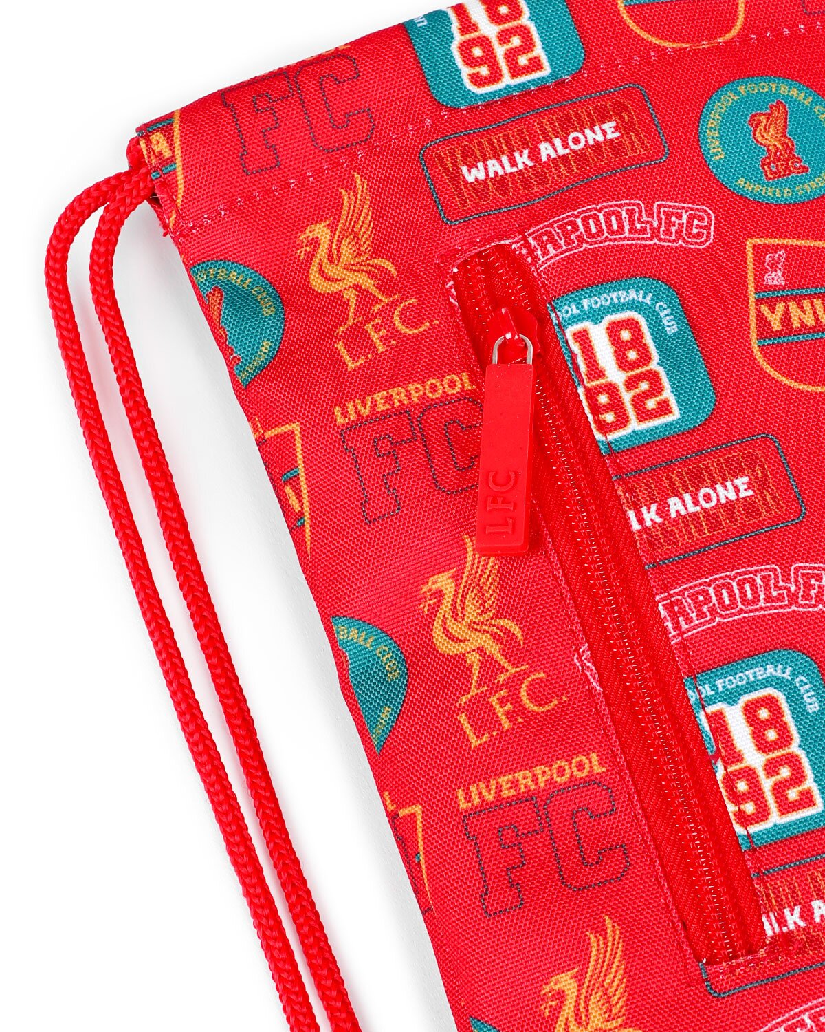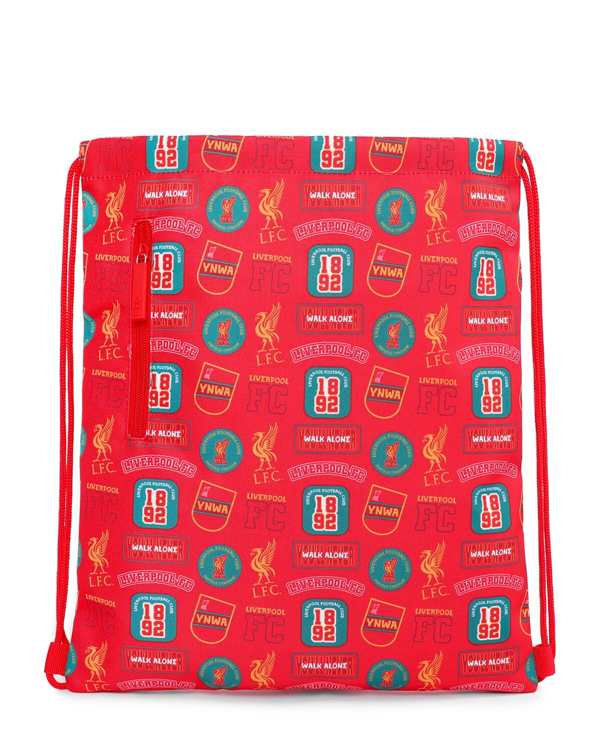 - Drawstring gym bag with Liverpool all-over print with front zip pocket.