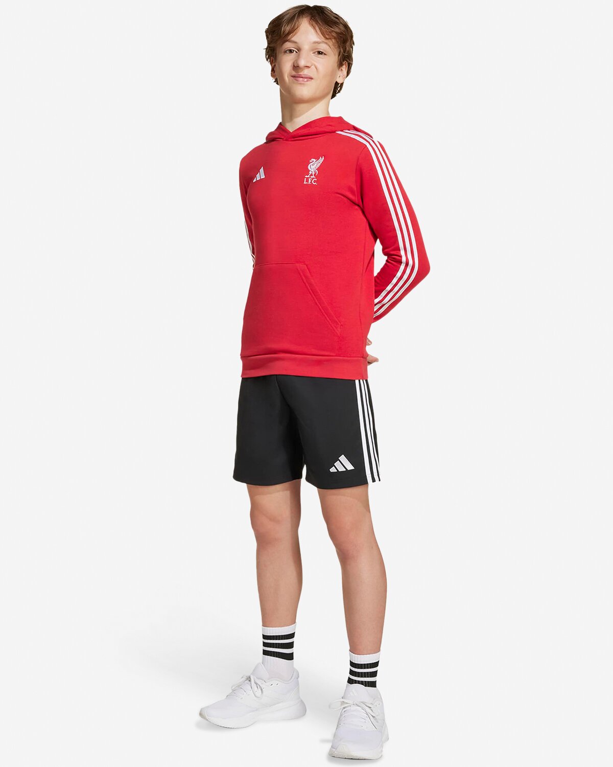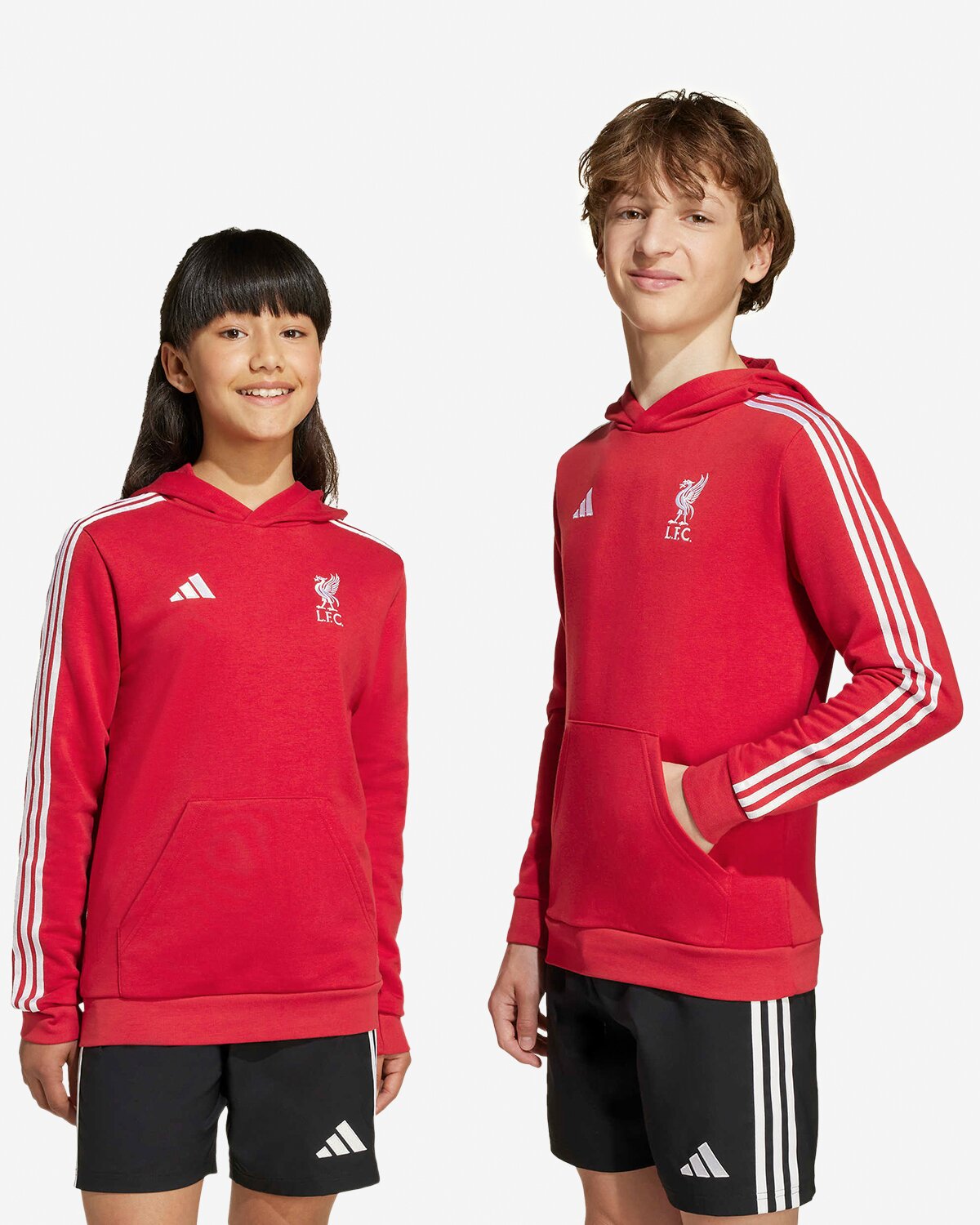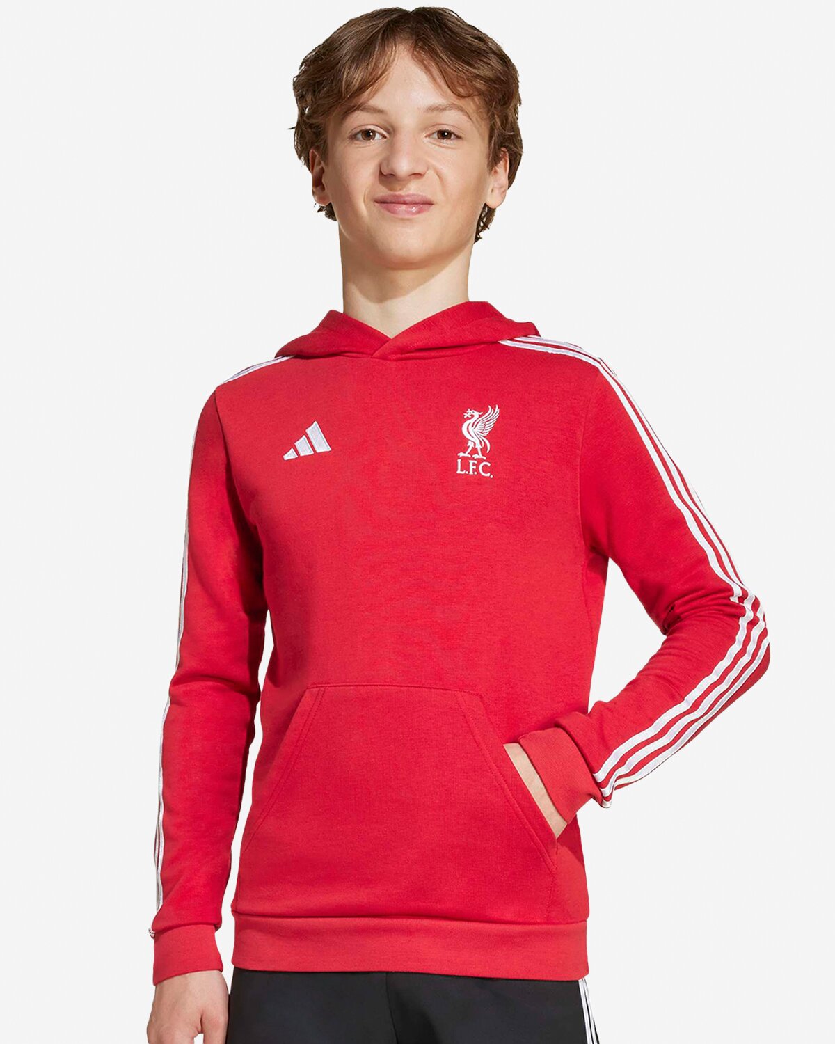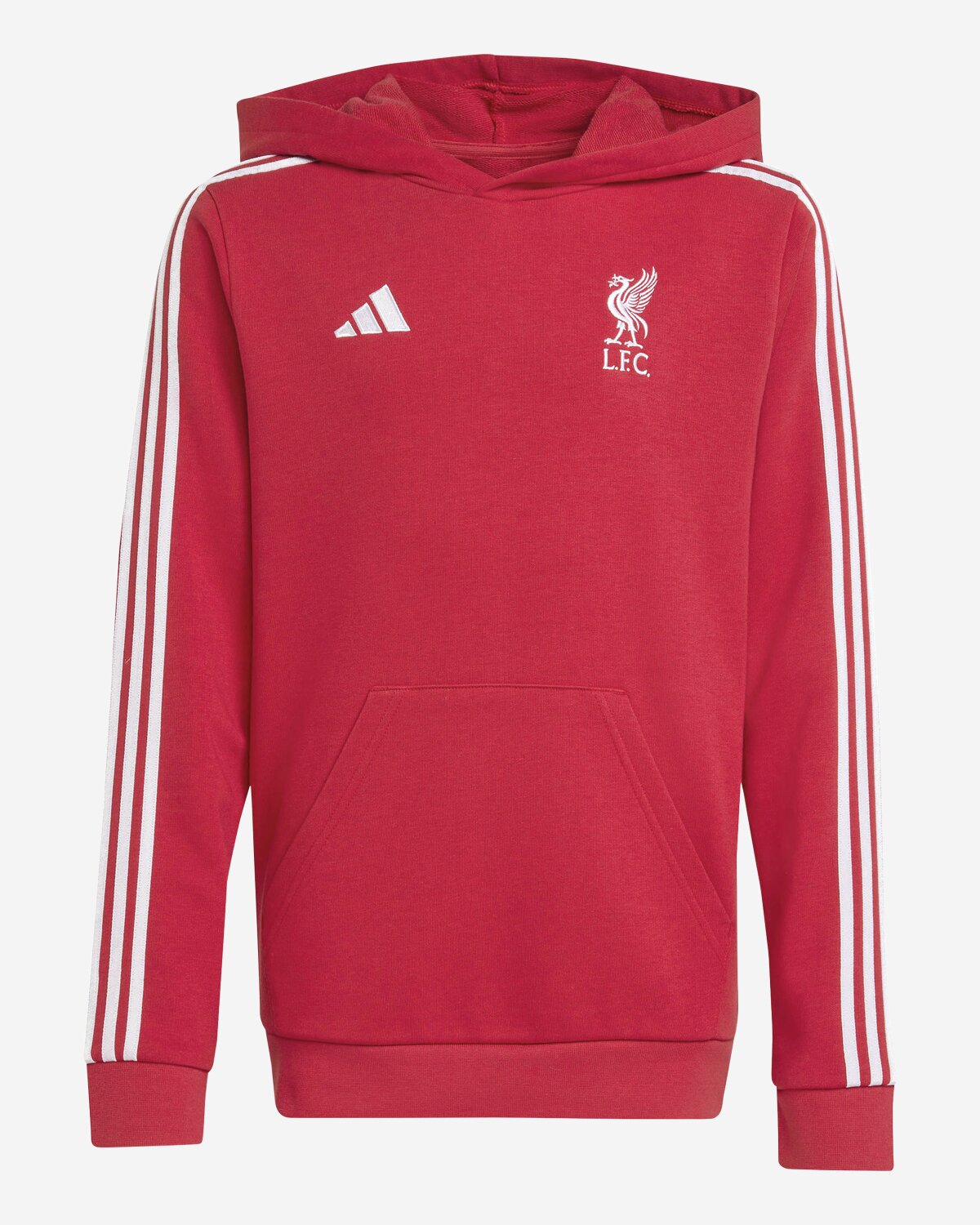 This LFC adidas Kids 25/26 Pullover Hoodie Red is made from soft Cotton-blend French terry fabric that keeps you cosy in your colours. An embroidered club crest on the chest leaves no doubt where your football allegiances lie.