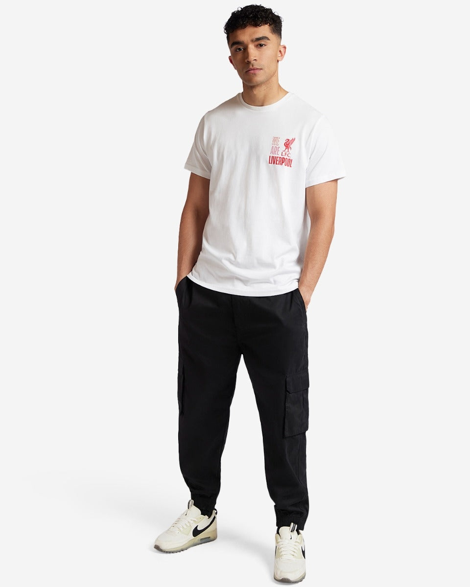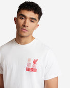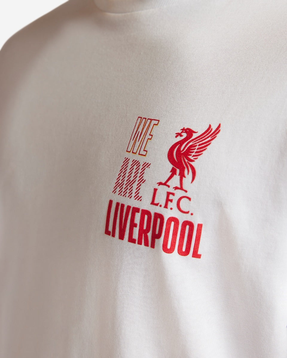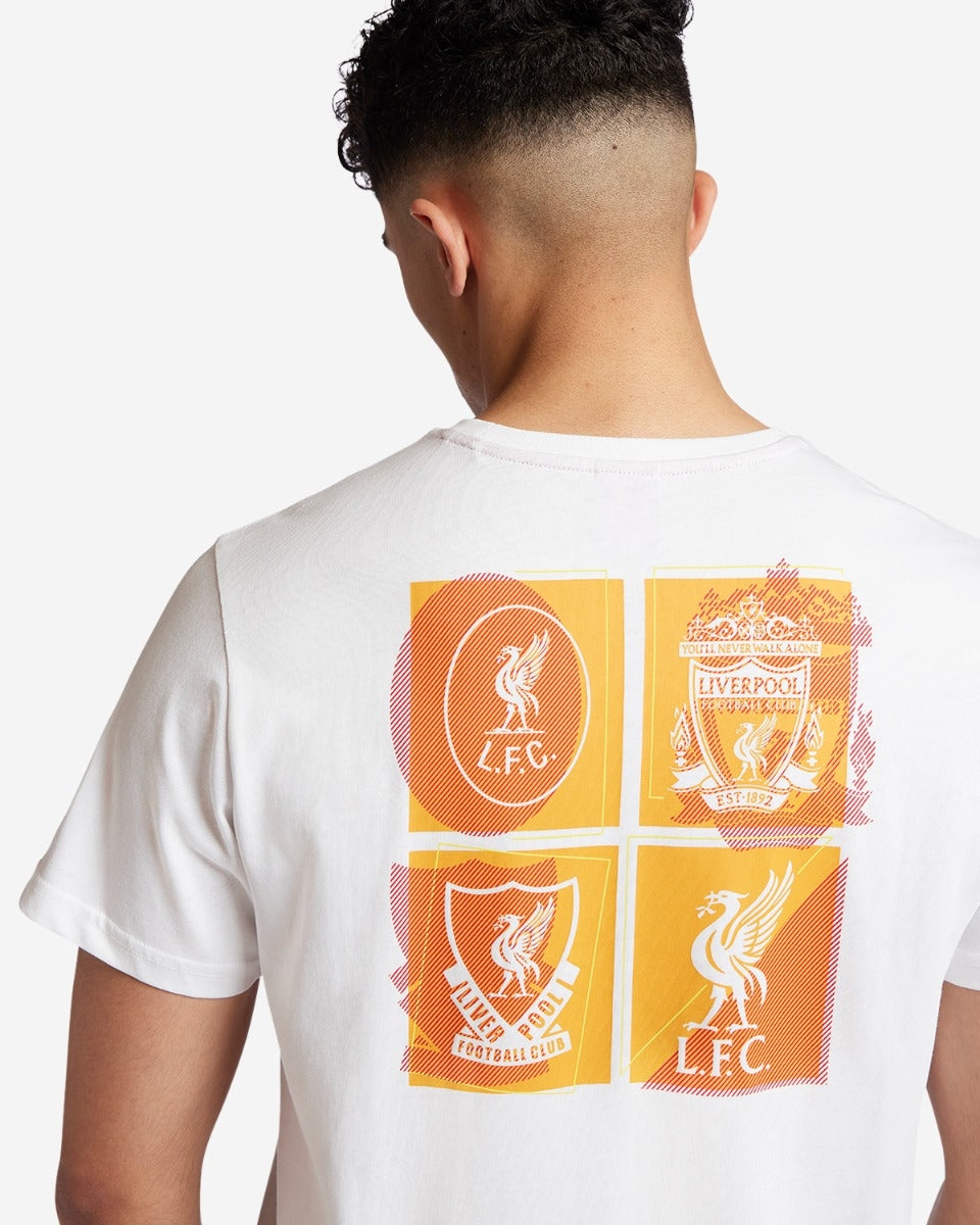 - White short sleeved, crew neck tee with a graphic printed, 4 crest montage in Red, Yellow and White to the back, with the LFC Liverbird and "WE ARE LIVERPOOL" text in smaller print at the front to the left chest.