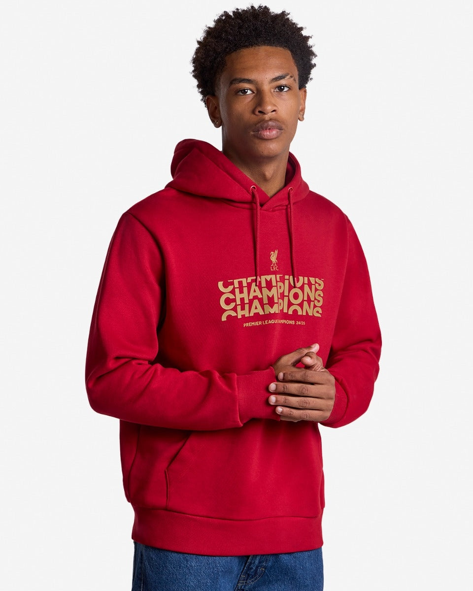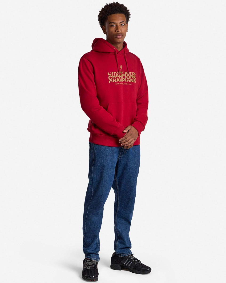 Celebrate Liverpool FC's record 20th League Title with the LFC Mens Champions Text Hoody Red, featuring a proud display that the Reds are Champions again on a fashionable addition to your wardrobe!