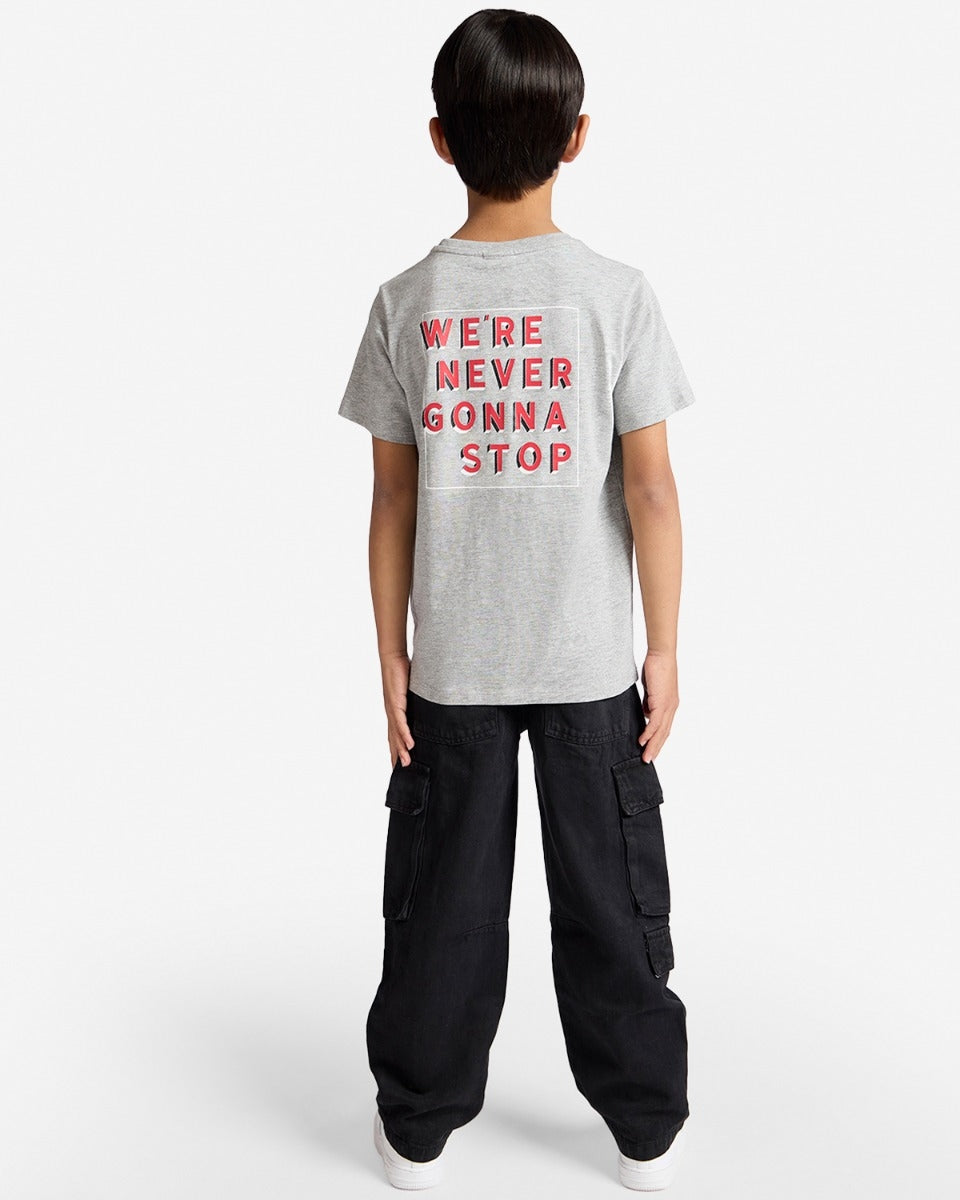- Juniors short sleeve Grey Marl tee with graphic "Never Gonna Stop" inspired design print with other Liverpool FC imagery to front.