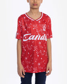 This LFC classic Candy home shirt was worn when Liverpool won the title in the 1989-90 season under manager Kenny Dalglish. Highlights of the season included a 9-0 win over Crystal Palace, with Aldridge scoring his last goal for the club. Legendary players to wear this shirt include Hansen, Barnes, Marsh, Aldridge, Whelan and Nicol. The original features in the LFC Museum. The LFC Retro Junior Candy Home Shirt features: Red home shirt replica with geometric design Raised retro LFC crest and Candy sponsor in white Cross-over crew neck with grey and red detail Red and white seam detail across the shoulders