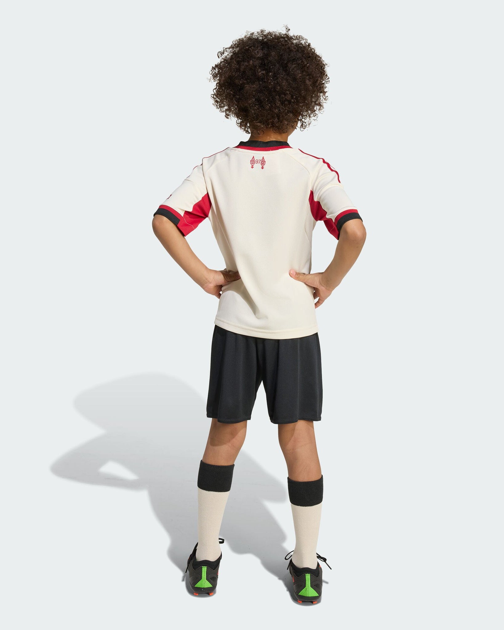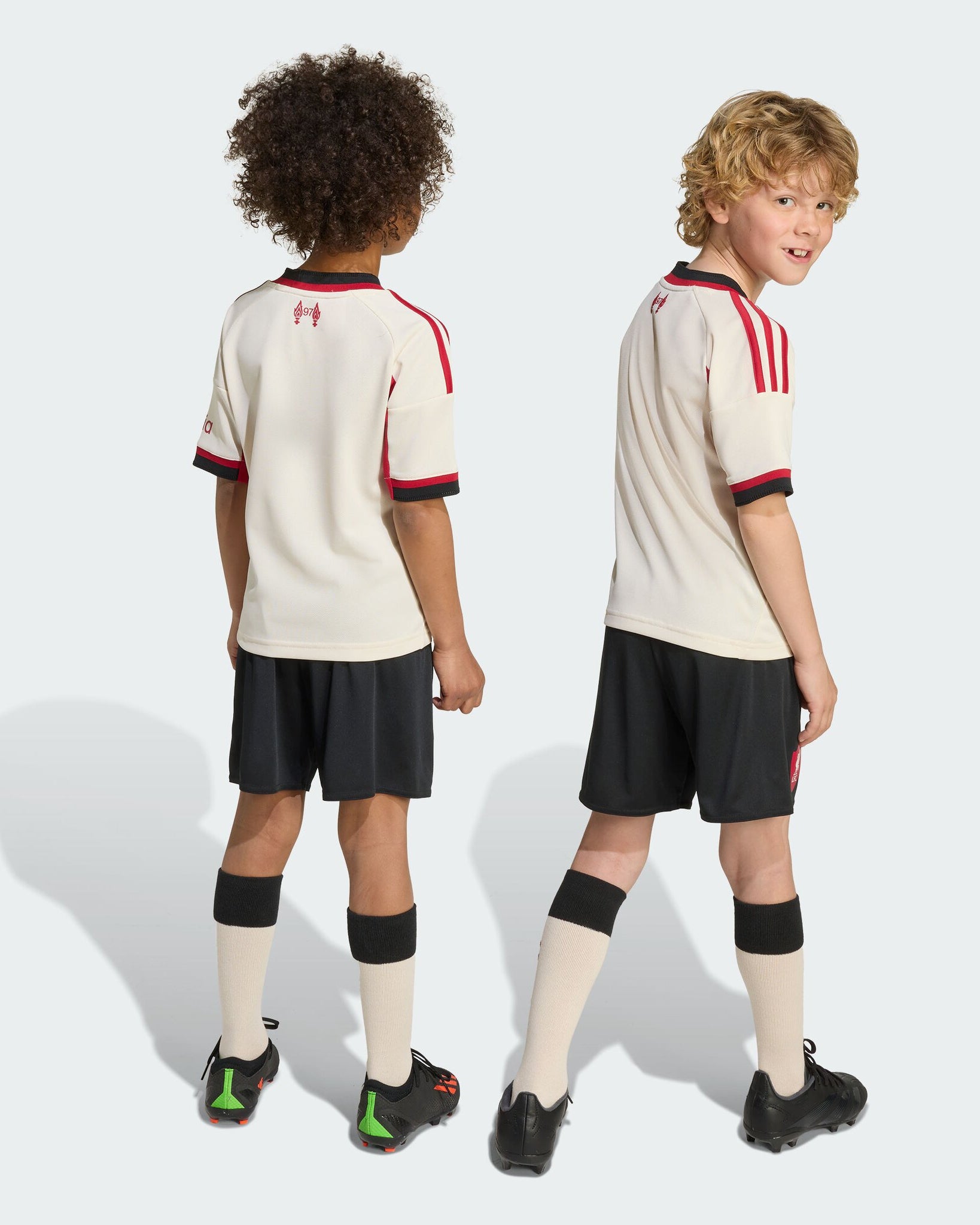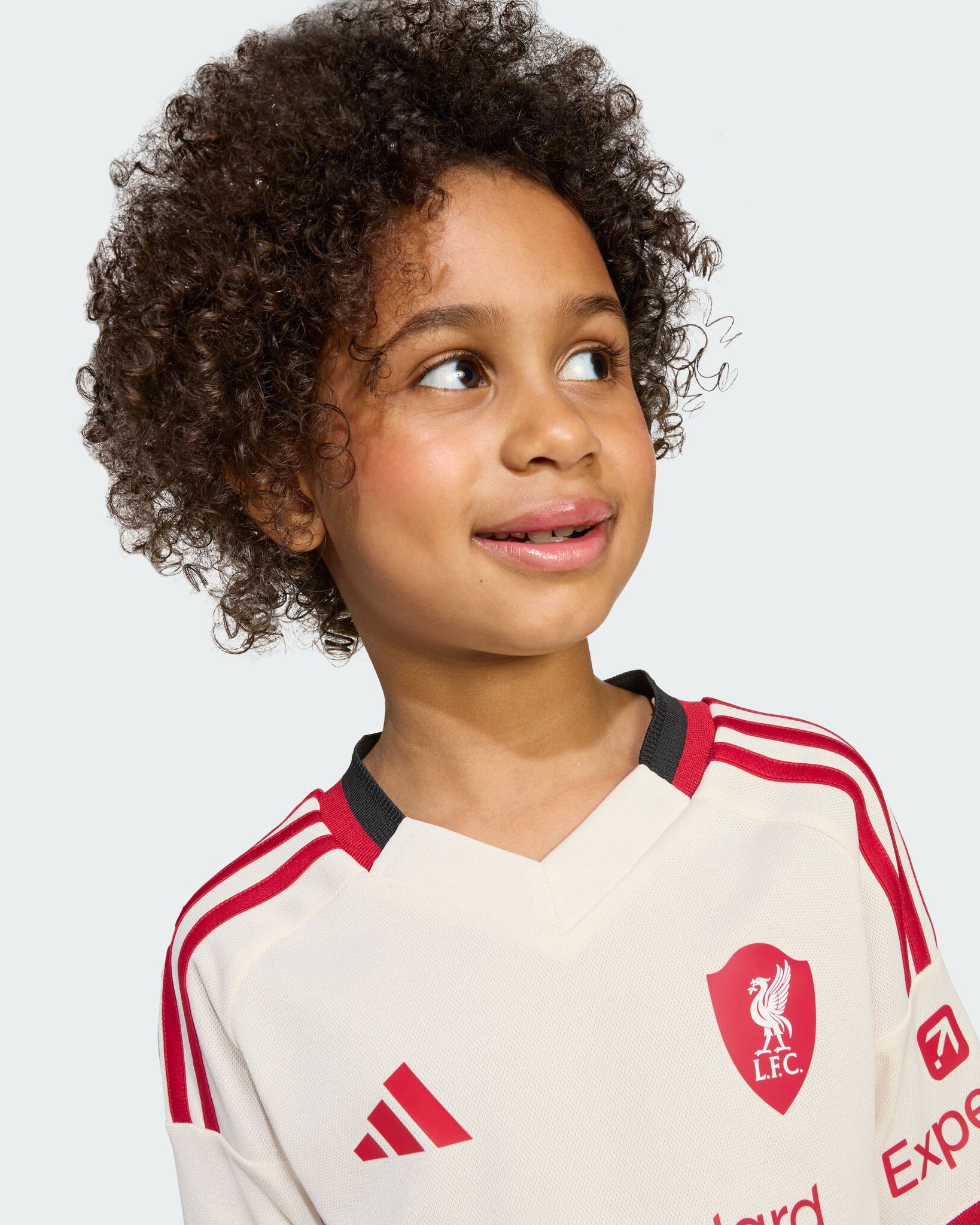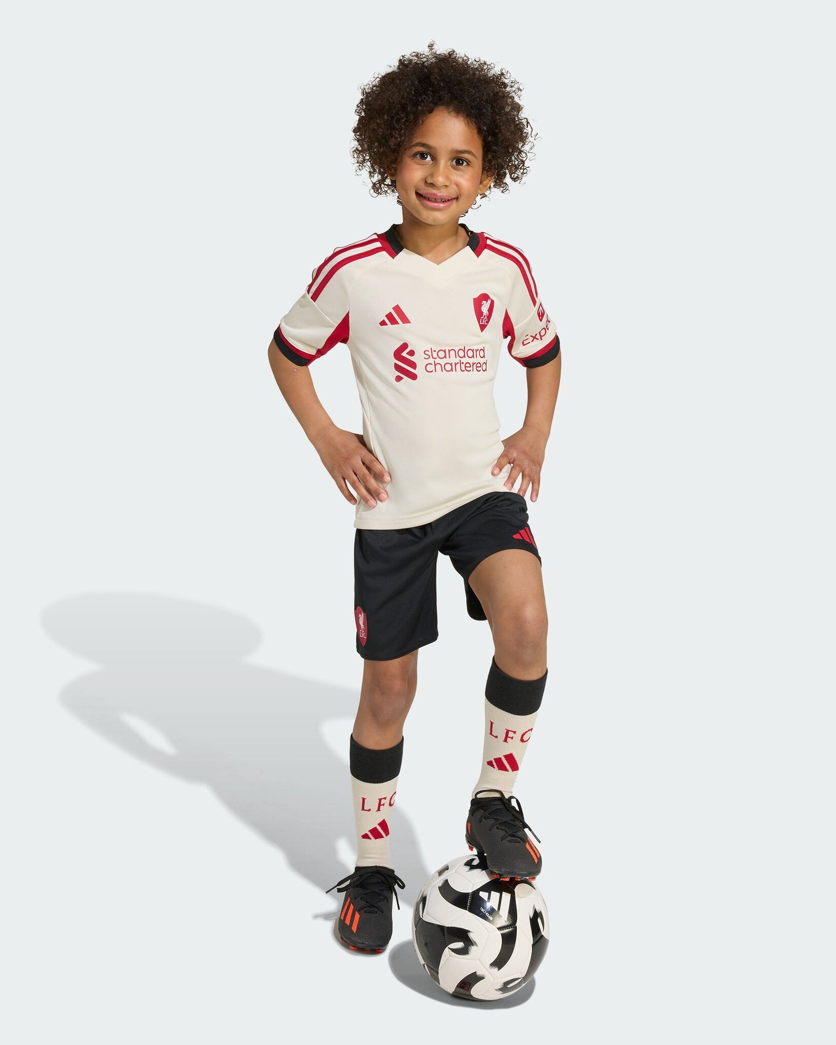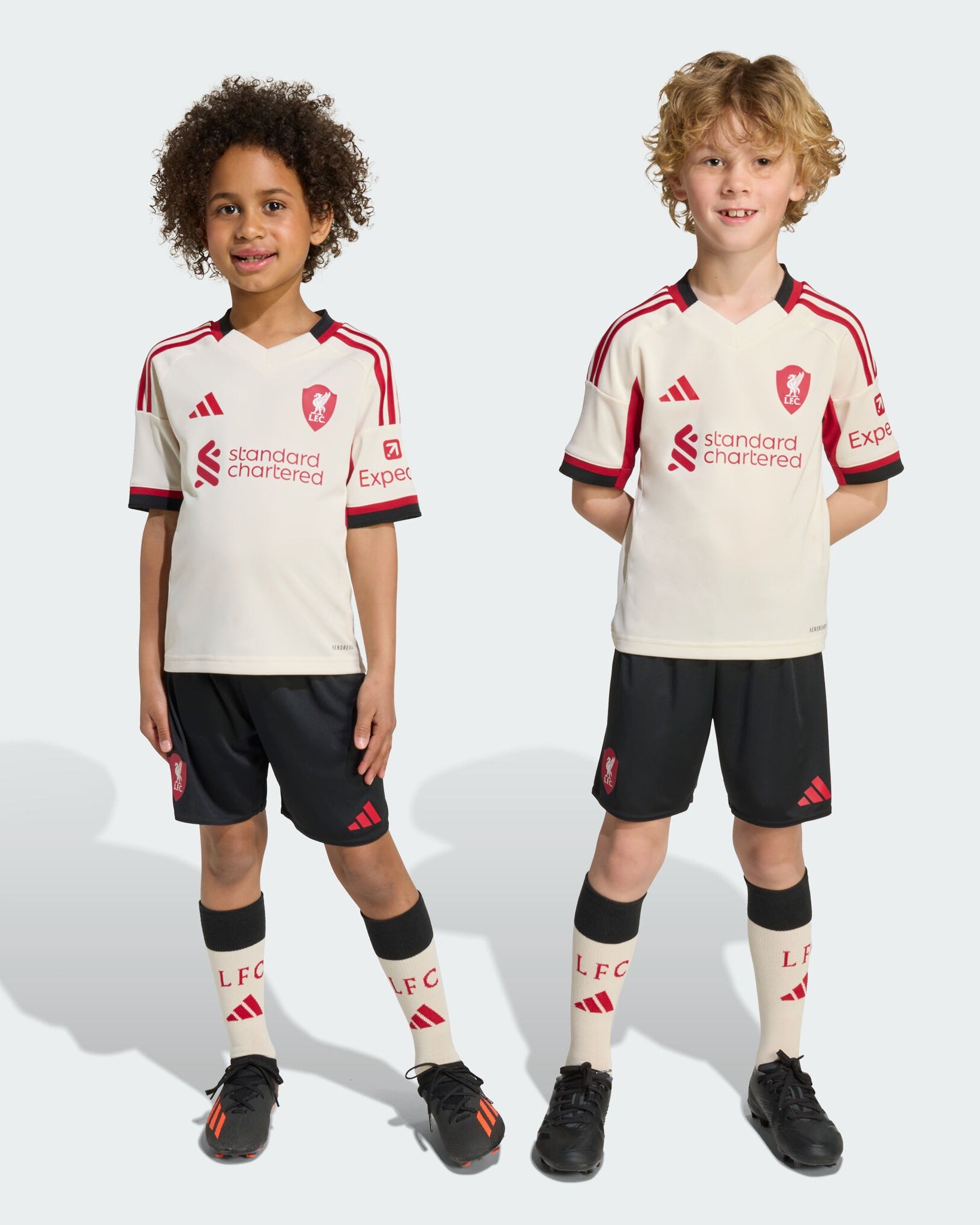 the shoulders, the Liverpool home kit for 25/26 brings to mind the likes of Steven Gerrard, Xabi Alonso and Fernando Torres in the late 2000s. - Away kit: Predominantly ecru with flashes of red and black adorning the sleeves and socks, the new away kit has an eye-catching design so you're sure to stand out from the crowd no matter where you're watching the game.