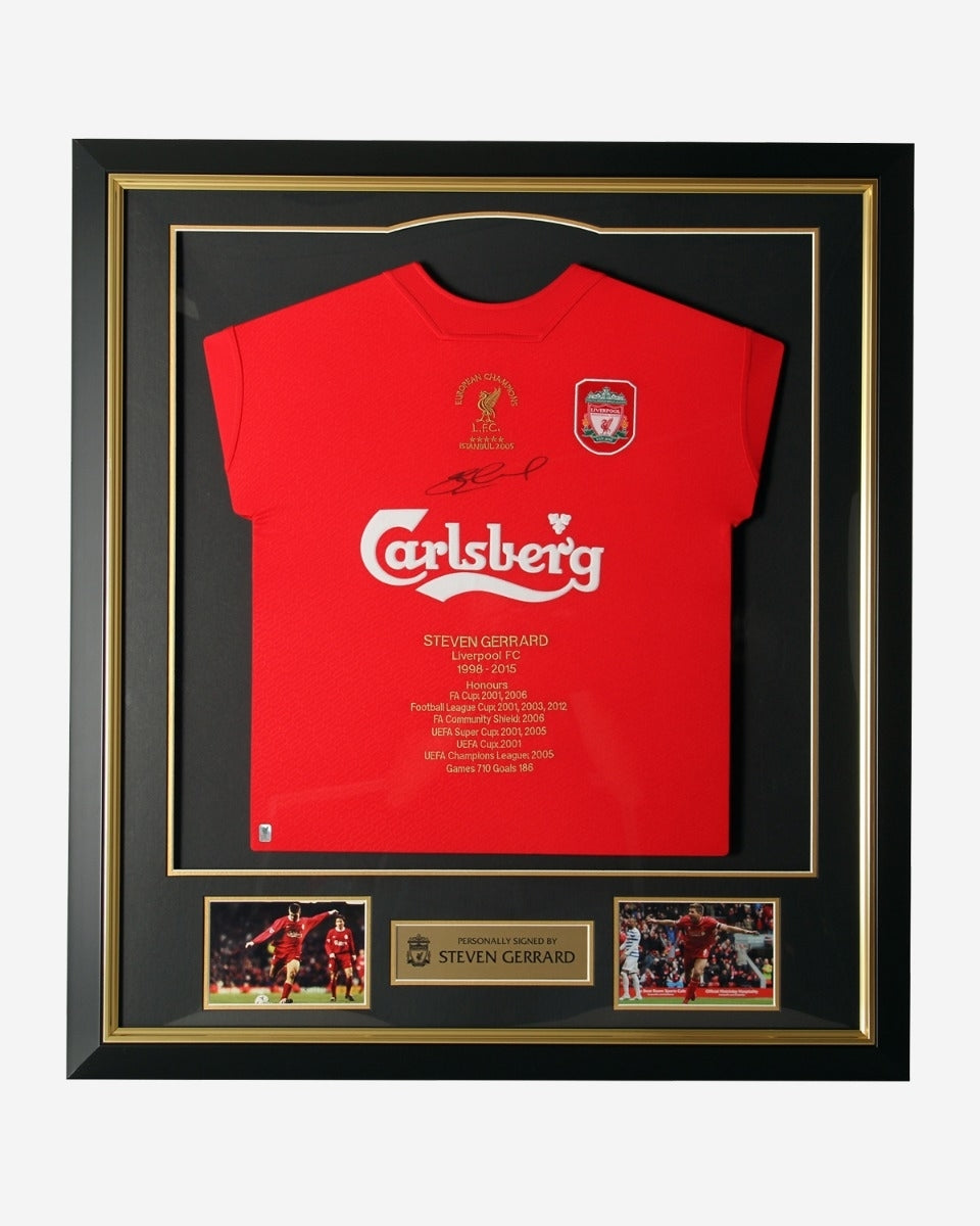 - LFC 2005 home shirt with listings of career achievements hand-signed by LFC Legend Steven Gerrard.