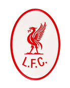 - Oval shaped metal sign with LFC red detailing on an off white background.